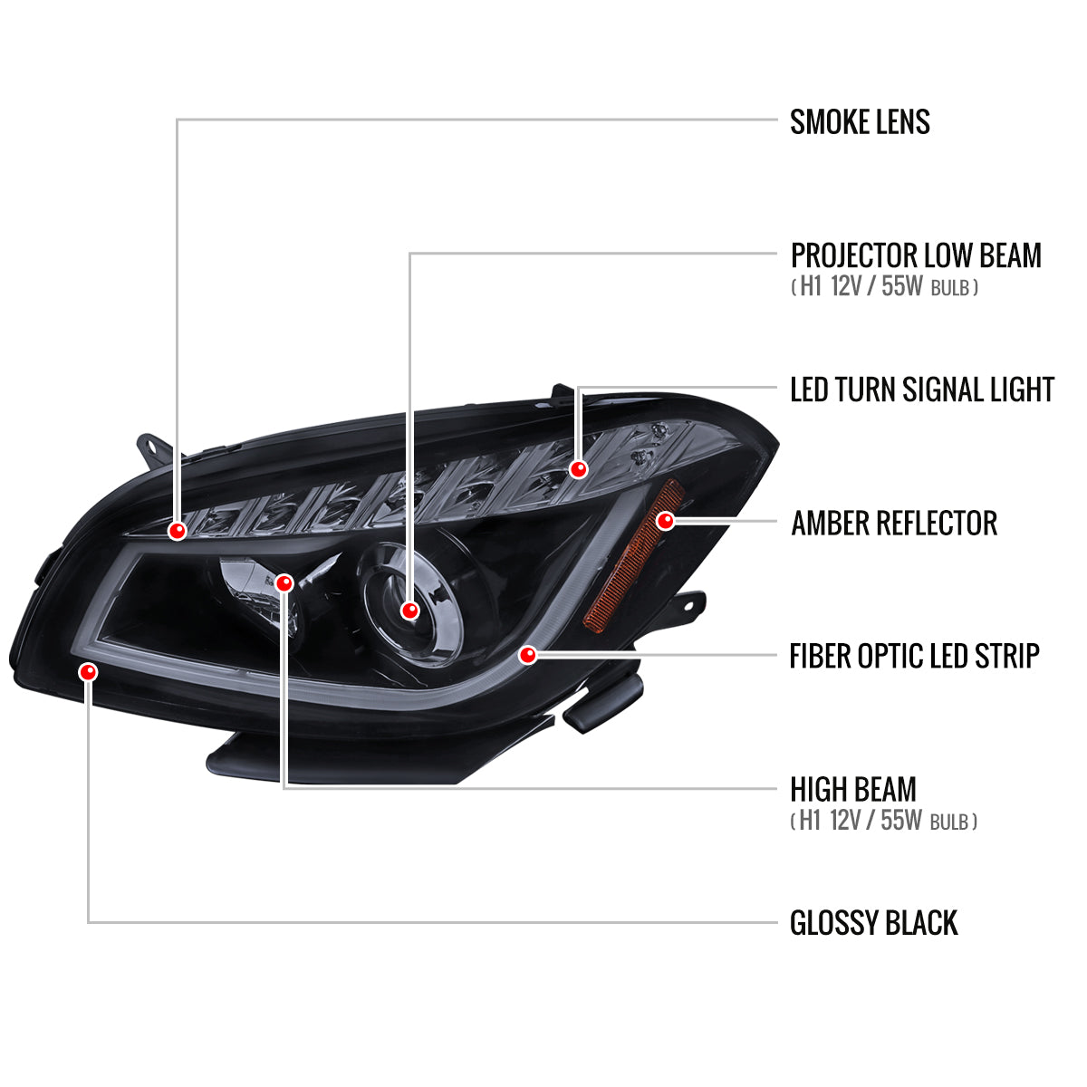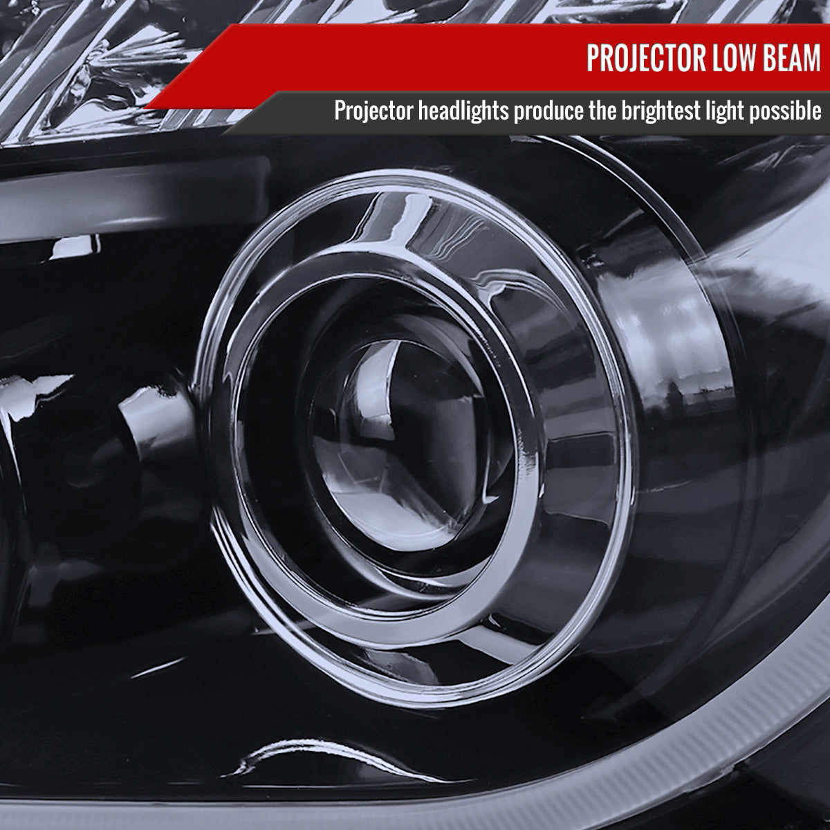 - Comes with glossy black housing, smoked lens projector headlights w/ LED bar & LED turn signal lights