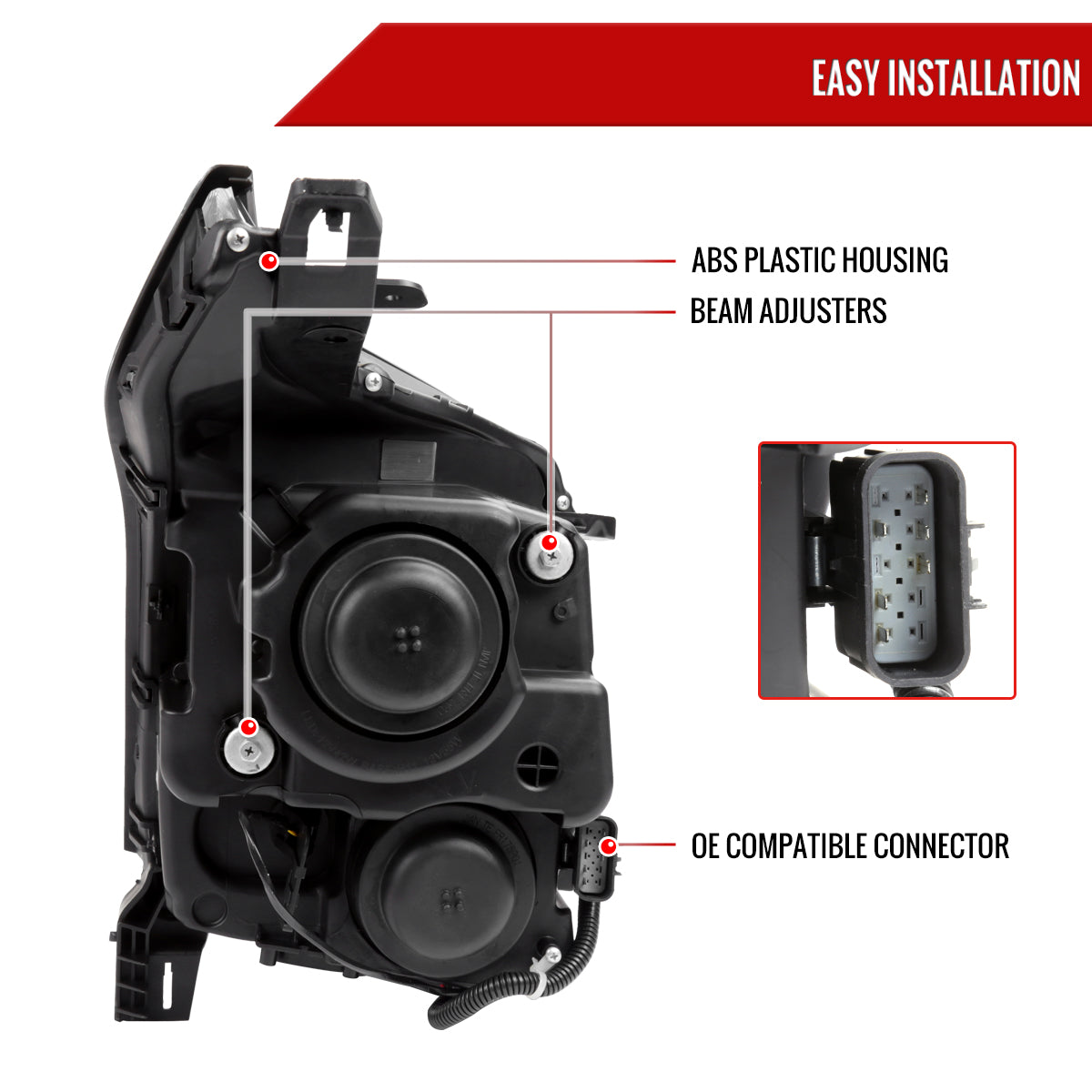 - Comes with (1) pair of matte black housing projector style headlights with clear lens equipped with switchback function