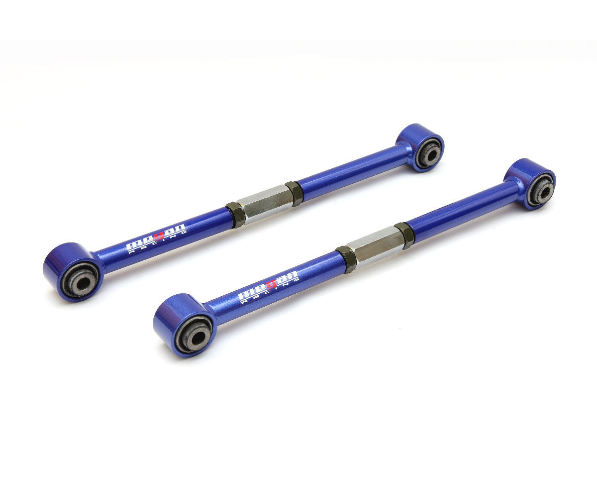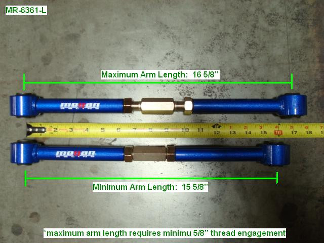 These rear Lower-Rear Arms are adjustable to fine tune your cars handling in the rear. When lowering a car, these will eliminate premature tire wear caused by the rear wheels riding upon the inside tread only. However, you will also slightly effect Toe and your track width of the vehicle.